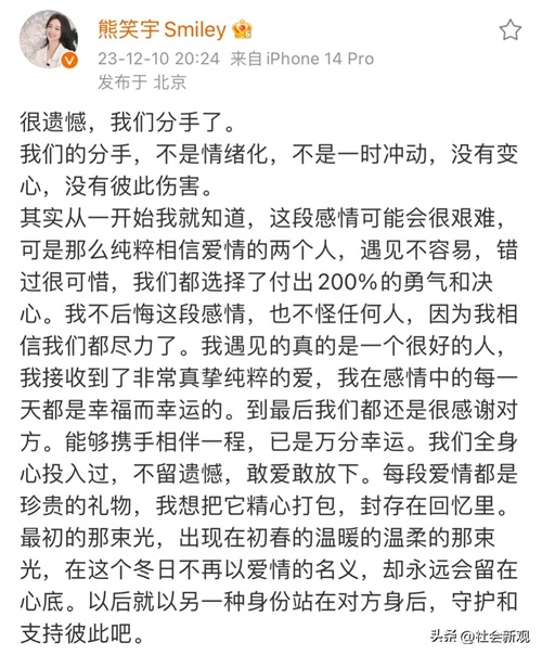 熊笑宇也在同一时间发的微博,微博中称这次分手不是一时冲动,是经过两人双方深思熟虑的,三年半的日子里在一起很幸福,未来也会在心底守护和支持他!