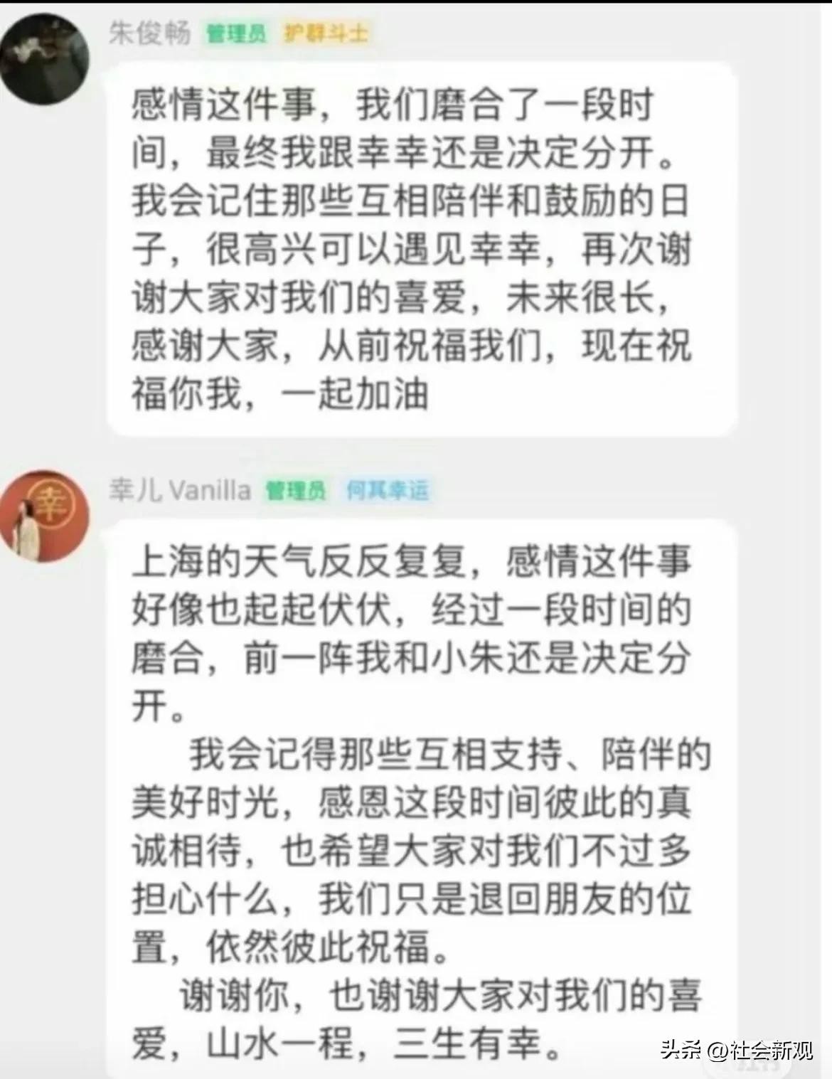 另外“幸运珠”cp朱俊畅郜幸也在粉丝群里宣布分手了,他们也是笔者很喜欢的一对,200公里的异地恋看来不是很靠谱!