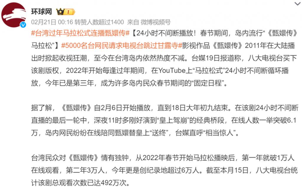 就说Sir在春节期间看到的一个新闻,#台湾过年马拉松式连播甄嬛传#。