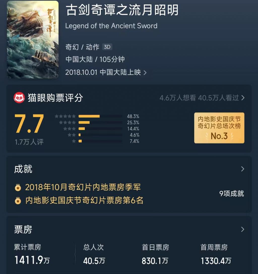 前一年,王力宏、宋茜主演的《古剑奇谭之流月昭明》上映,外国导演水土不服,可也拿到了将近 1400 万的票房。