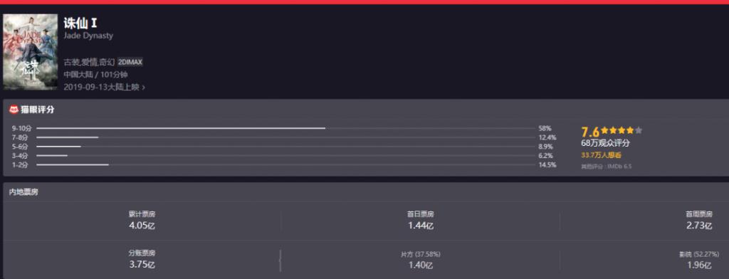 2019 年,肖战、孟美岐主演的《诛仙 1》上映,豆瓣 4.5,却依旧拿下了 4 亿票房。
