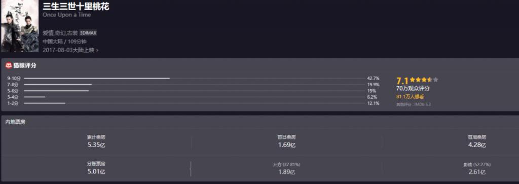 再前一年,杨洋、刘亦菲主演的《三生三世十里桃花》上映,豆瓣 4.0,票房 5.35 亿。