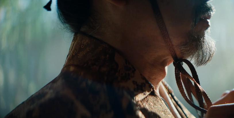 比如,对吉井虎长服饰的特写,将服饰的纹路与质感放大,营造诸侯贵族的质感。