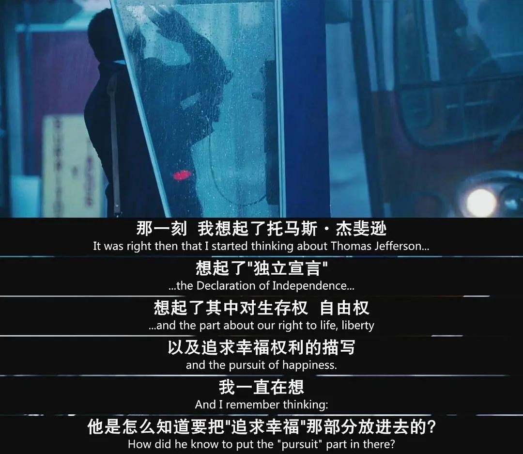 正如电影引用《独立宣言》的片段:人们拥有生存权、自由权和追求幸福的权利。克里斯·加德纳当时想,杰斐逊怎么知道,在幸福前面要加“追求”二字,也许幸福是我们只能追求。