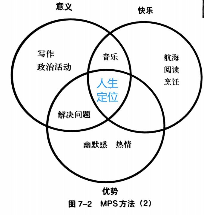 哈佛大学泰勒·本-沙哈尔博士在《幸福的方法》一书给出了找准人生定位的方法:MPS方法,指的是意义(MEANING)、快乐(PLEASURE)、优势(STRENTHS)。