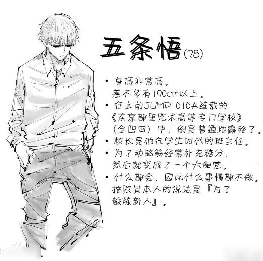 之前独眼猫在五条悟的个人简介中就有提到,五条悟的身高非常高,差不多有190cm以上。在公式书中,他超过了190cm的那条线,目测大概是191cm或者192cm左右。