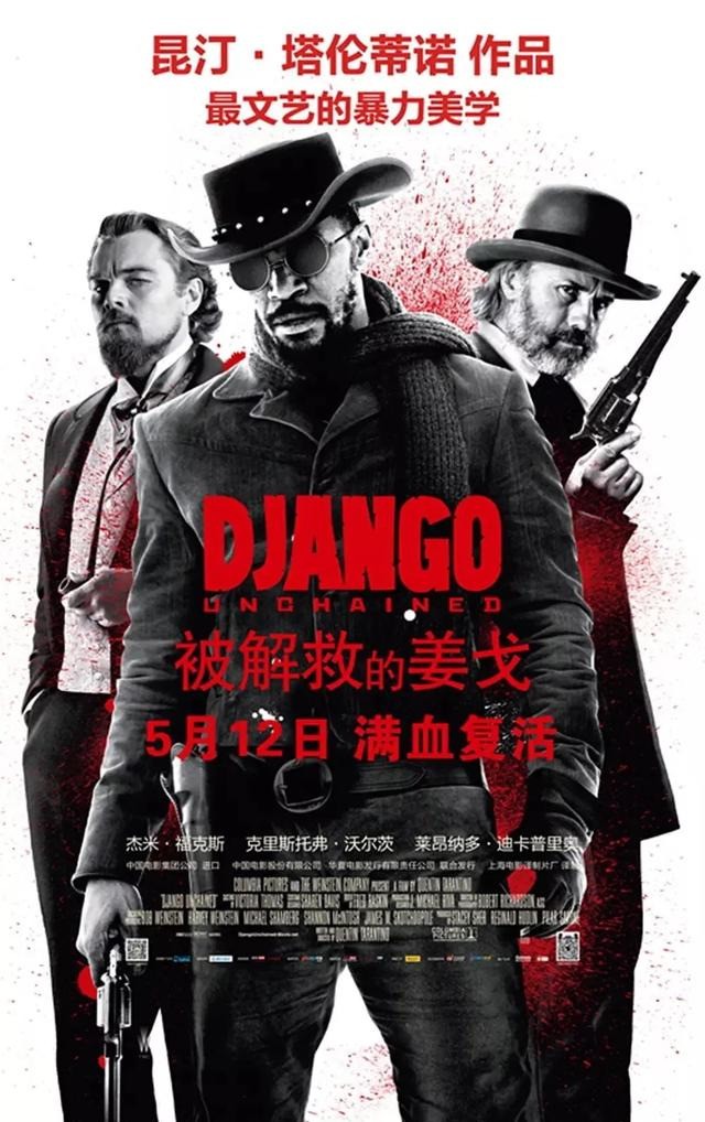 《被解救的姜戈》电影海报上那根铁链,与《断锁怒潮》异曲同工,后者正是一部以解救黑奴为题材的作品,而本片铁链后红色的背景更预示着电影中,打断的锁链通往自由之路铺满了血腥。