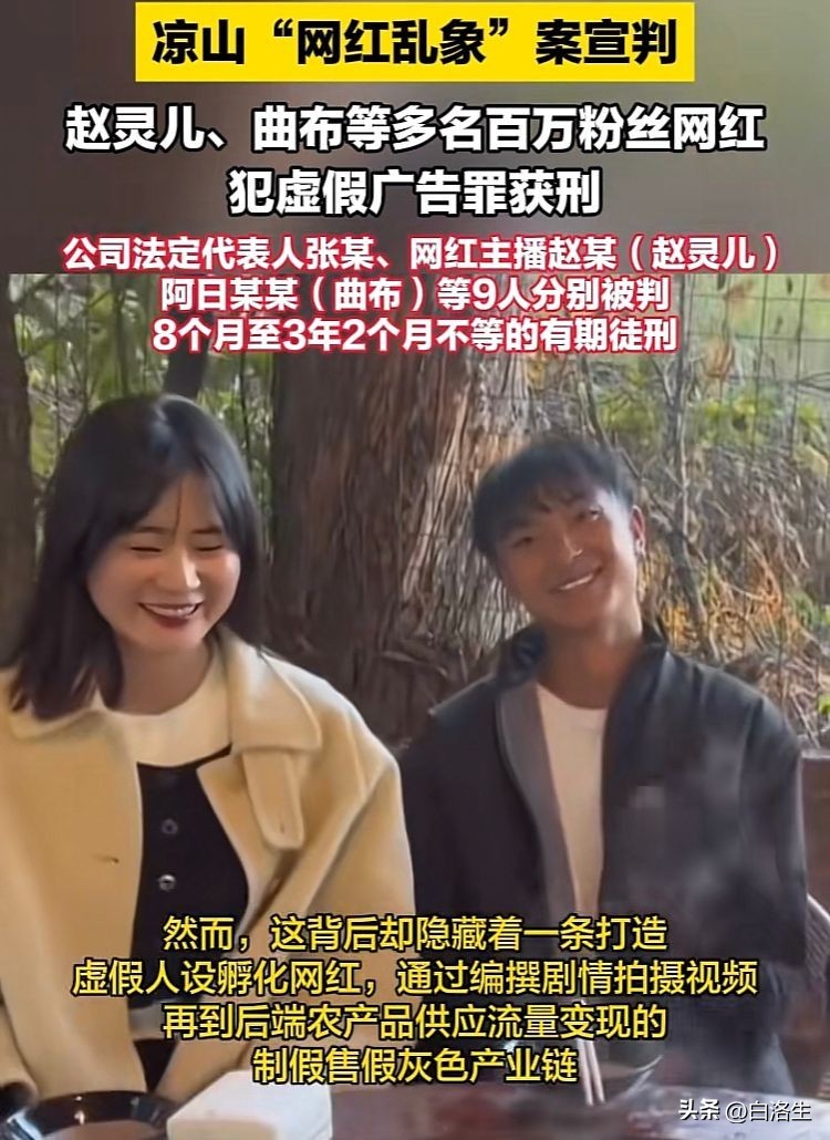 12月28日,凉山昭觉县人民法院依法对该案一审宣判,创始人张某及其旗下的网红赵某、阿日某某等9人,犯虚假广告罪,分别被判8个月至10个月不等的有期徒刑,并处2万元至10万元不等的罚金。