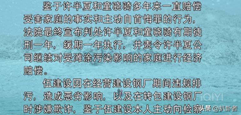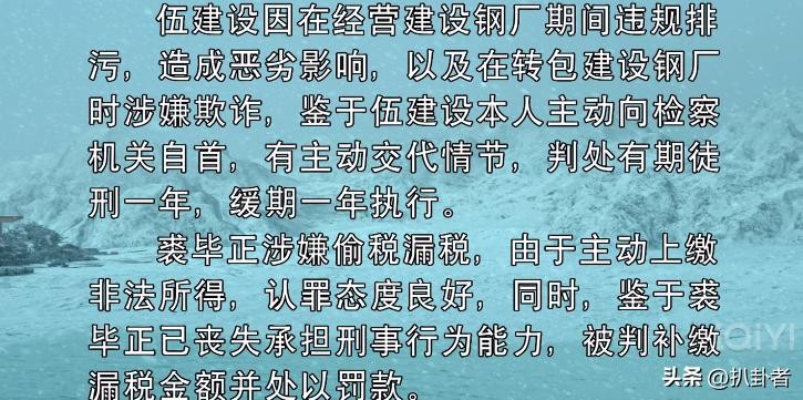 伍建设(刘威饰演)因为排污和涉及欺诈,被判处有期徒刑一年,缓刑一年。裘毕正也因为税务问题而被判补缴和罚款。