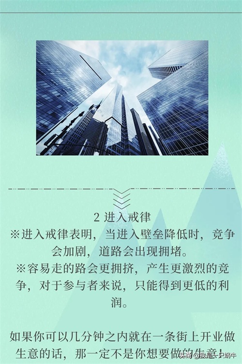 首先,作者提到,进入任何一个行业都应该有一定的壁垒,而当这种壁垒非常低的时候,也就是人人都可以从事这项生意的时候,那就是一项不好的生意,因为这意味着竞争的加剧,就好比一场十人赛的赛制变成了万人的马拉松,你想跑入前十名难度越来越大,所以选择一个很好的赛道,选择一项正确的赛道是非常重要的。