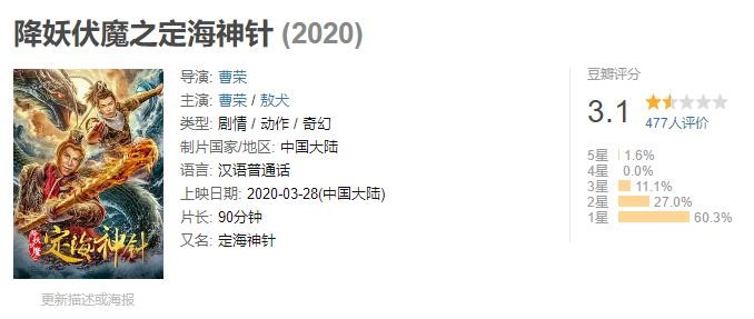 曹荣自导自演的《降妖伏魔之定海神针》不久前在网络上线,目前的豆瓣评分只有3.1,可以说是十分惨了。影片讲述孙悟空(曹荣 饰)将金箍棒送往太上老君炼丹炉去“升级”,金箍棒化成人形后掉落凡间,太上老君派徒弟银角(女)下凡间找金箍棒,后续金角与金箍棒人行产生了感情线……
