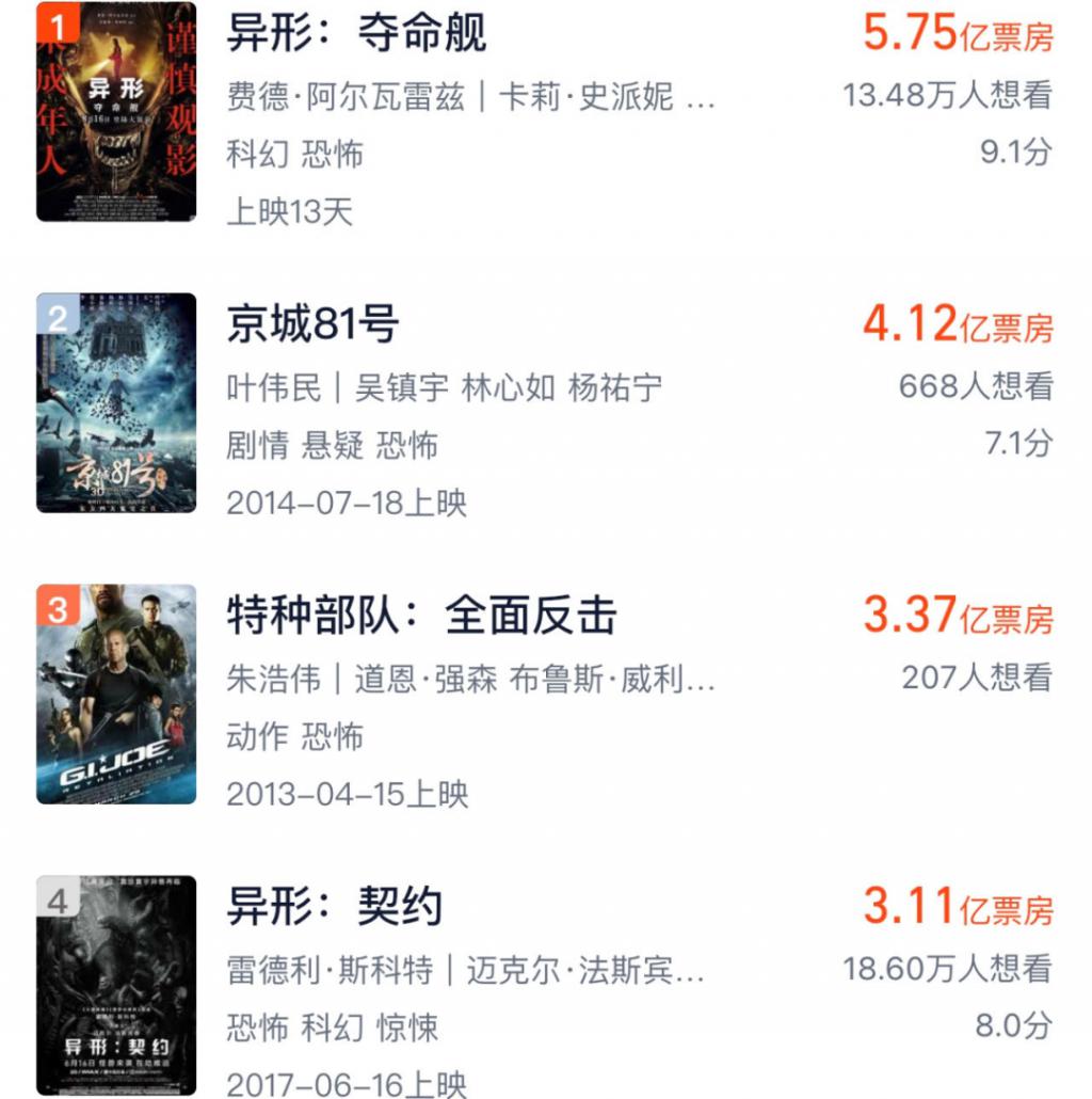 一个让人啼笑皆非的消息:《异形:夺命舰》超越了《京城 81 号》,拿下了内地恐怖片的票房榜冠军。