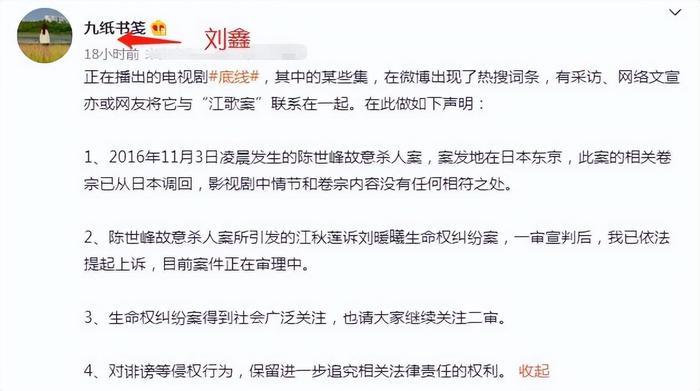 刘鑫对《底线》翻拍“江歌案”一事极为不满,特此发声明斥责剧方存在恶意抹黑其形象,为江秋莲“站岗”的行为,还列举了四条声明: