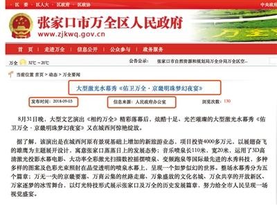 记者检索发现,张家口市万全区政府官方网站曾于2018年9月3日刊发一篇题为《大型激光水幕秀〈佑卫万全·京畿明珠梦幻夜宴〉》的文章。该文详细介绍了这部“水幕电影”的播出情况:2018年8月31日晚,大型文艺演出《相约万全》精彩落幕后,炫酷十足、光芒璀璨的大型激光水幕秀《佑卫万全·京畿明珠梦幻夜宴》又在城西河惊艳绽放。