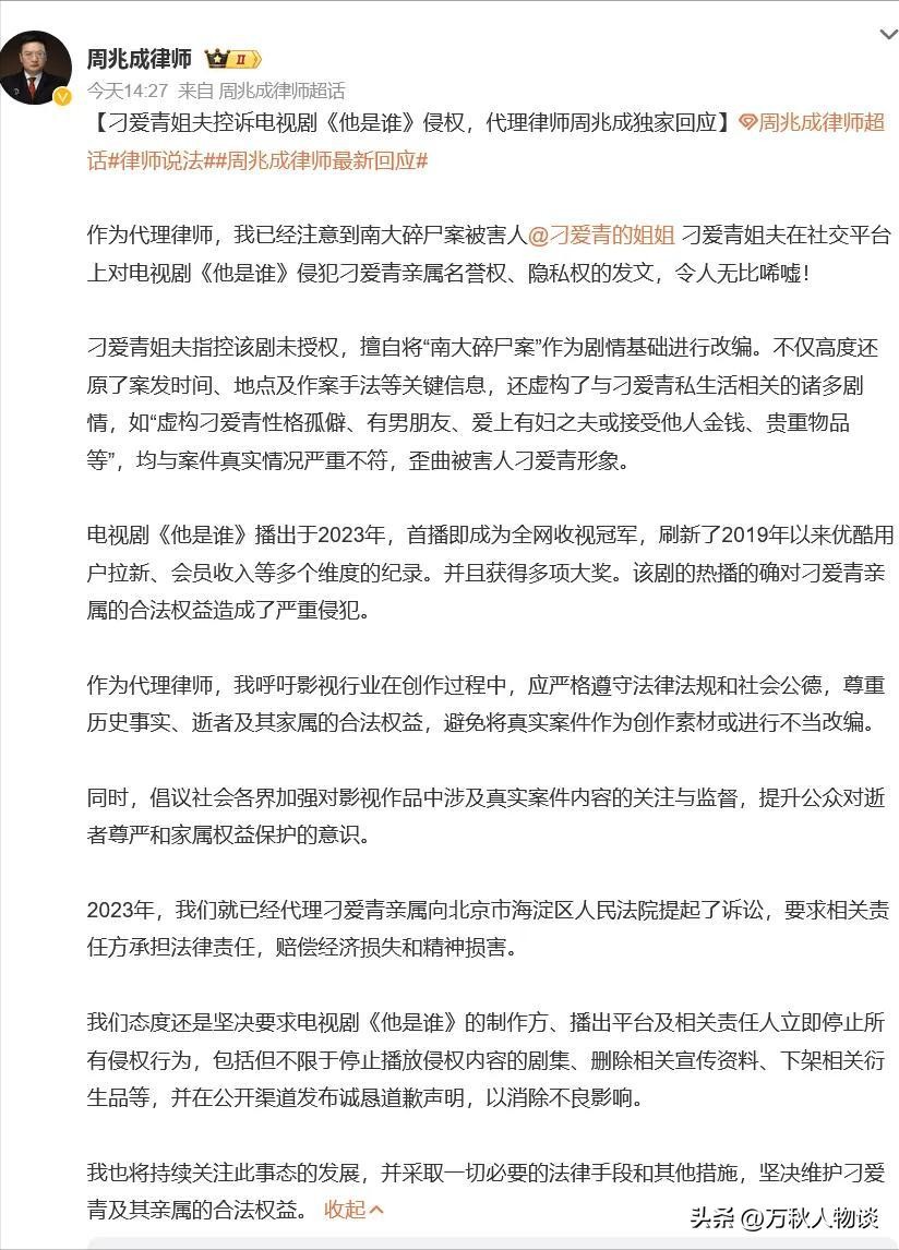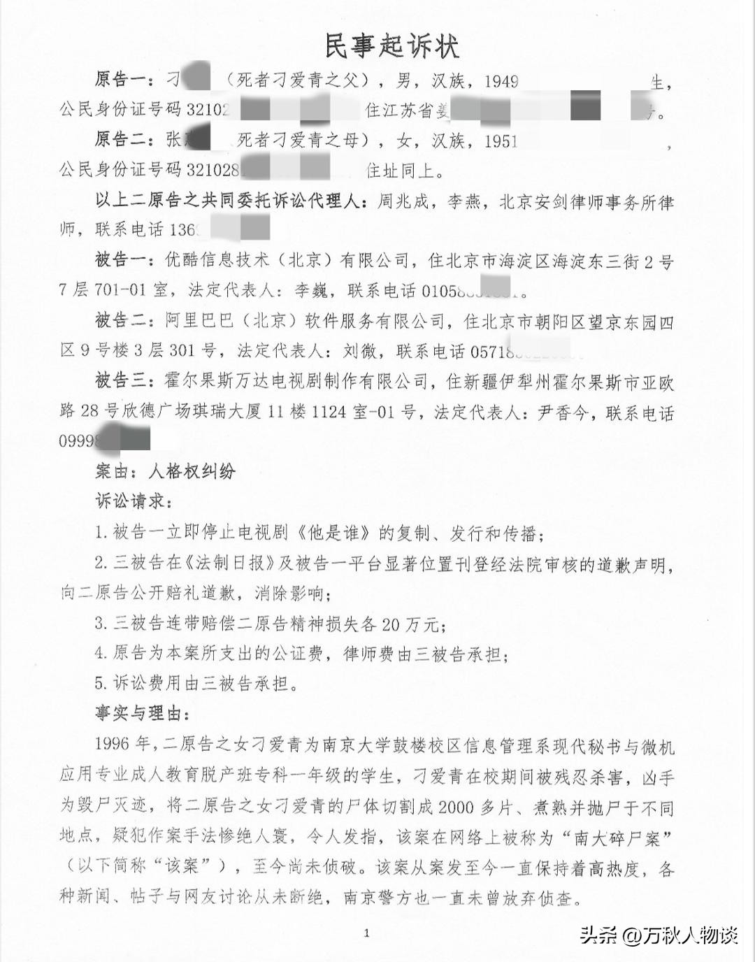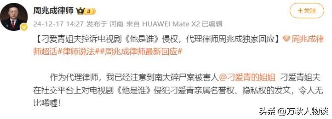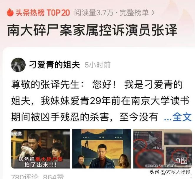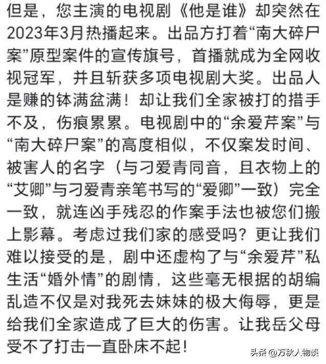于是刁爱青的姐夫便在网上发布了这样的文章,其中指出《他是谁》这部剧在宣传和播出的时候,都是以“南大碎尸案”为噱头来吸引观众。