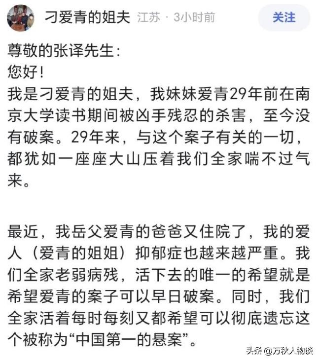 而这篇文章的作者就是刁爱青的姐夫,他的妹妹就是29年前震惊全国的“南大碎尸案”的受害人,这桩案子至今还没有侦破!