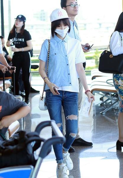 跟风其他三线以上明星,也要来个机场照的毛小姐,显然是没有强大的资本团队,还不足以请个像样的造型师给她好好拾到。于是穿着杀马特强子们人手一件的T恤还有破裤头就出来了。为了显示自己很红,还戴上了口罩帽子。只是,兔姐想提醒一下,下次可不可以换个口罩,我以为这是去打预防针。