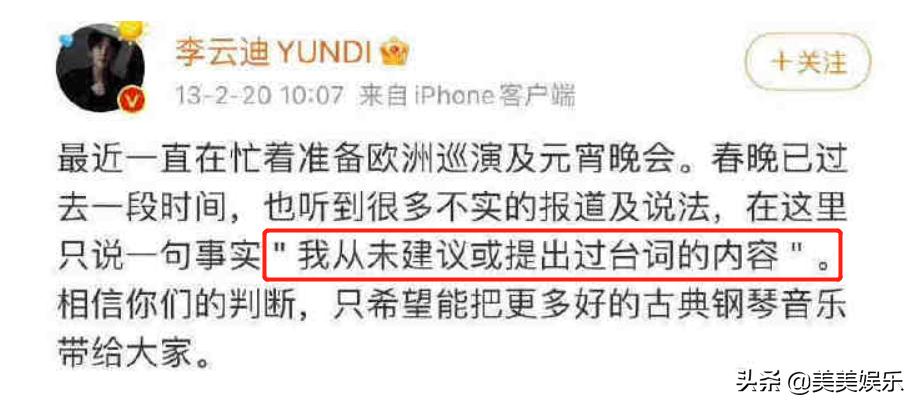 他发了篇声明对春晚的事件进行澄清,“找力宏”是演出前由李云迪方在对词时提出的,对方表示这样更有宣传点。