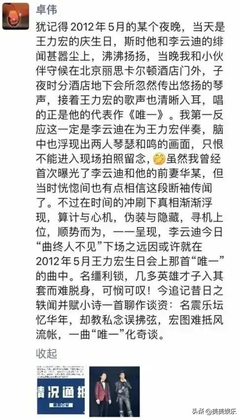 而近日卓伟朋友圈的曝光,似乎也实锤了当年李云迪有想捆绑王力宏炒CP的倾向。