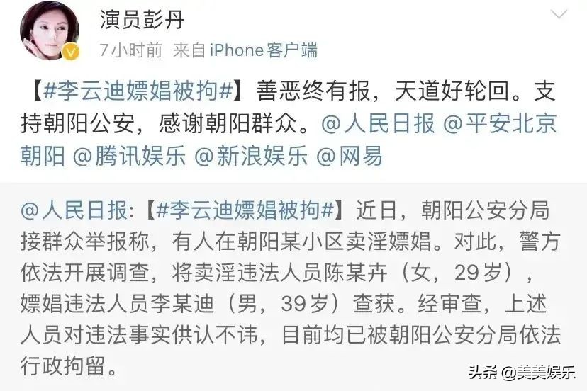要想知道,彭丹当时也只是33岁,何来的中年妇女?天道好轮回,如今李云迪声名皆毁,彭丹也出来转发发声:善恶终有报。