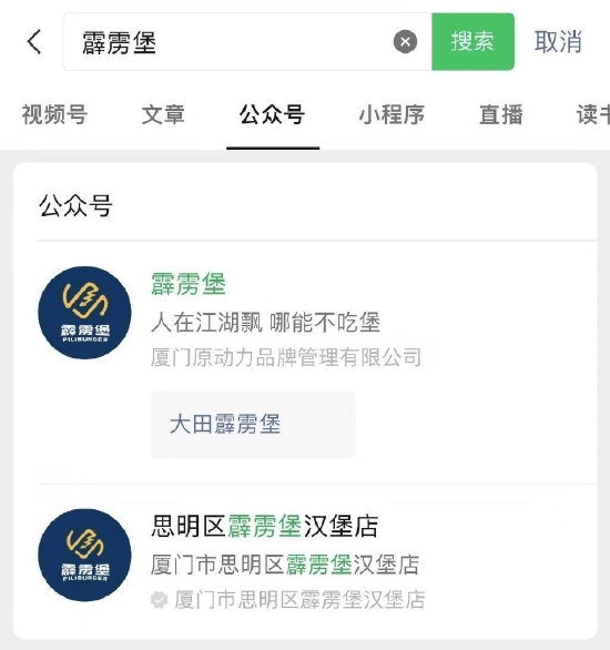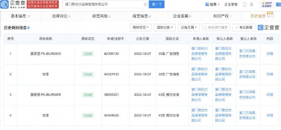 企查查信息显示,厦门原动力品牌管理有限公司曾成功注册两枚”霹雳堡“商标,不过,目前商标已被转让。查询发现,该公司关联的公众号名称仍为“霹雳堡”。