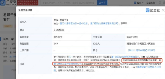 据企查查APP显示,近日,原告易烊千玺诉厦门市思明区快乐一堡小吃店和厦门原动力品牌管理有限公司、郭某某人格权纠纷案民事判决书公布。判决内容包括,厦门市思明区快乐一堡小吃店向易烊千玺道歉、对厦门原动力品牌管理有限公司应赔偿金额中的30万元承担连带责任等,公告人为福建省厦门市湖里区人民法院。