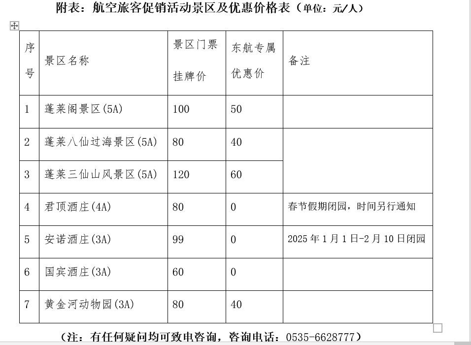 值得一提的是,当前东航携手蓬莱阁景区、蓬莱八仙过海景区、蓬莱三仙山风景区等4家景区和君顶酒庄等3家酒庄,重磅推出“乘东航航班,登蓬莱仙境——东航登机牌烟台专享礼遇”活动,享受半价及以上优惠。搭乘东航/上航(航班号为:MUxxxx或FMxxxx)航班的旅客,只需凭借五日内在烟台蓬莱国际机场进出港航班的登机牌或乘机凭证,即可畅行烟台蓬莱仙境。(活动截止到2025年4月30日)