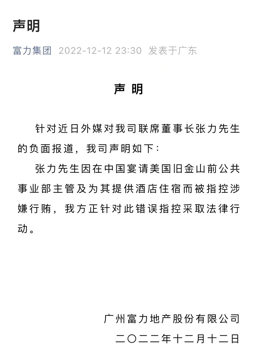 当天深夜,富力集团官微发布声明称,公司联席董事长张力因在中国宴请美国旧金山前公共事业部主管及为其提供酒店住宿而被指控涉嫌行贿,正针对此错误指控采取法律行动。