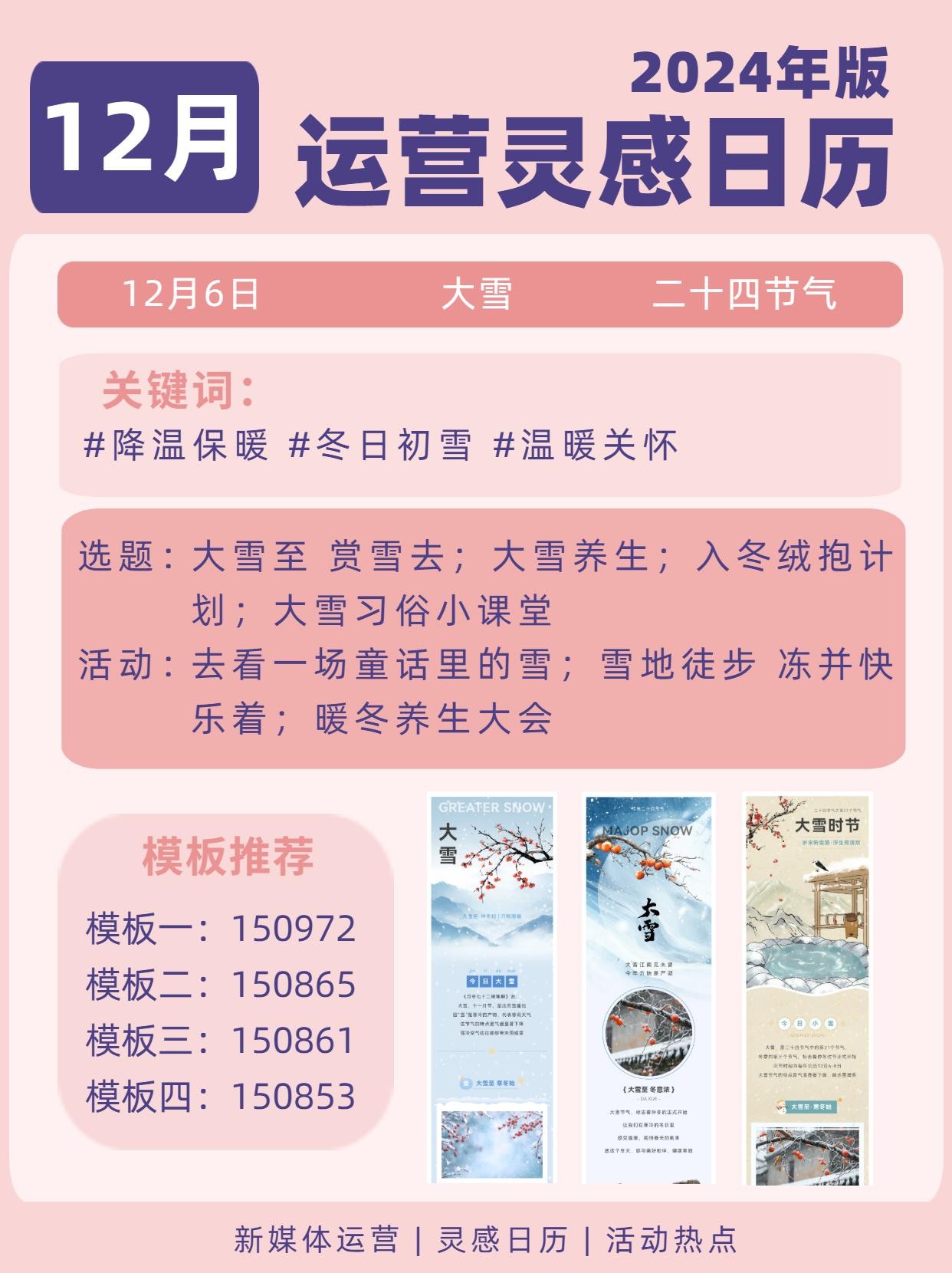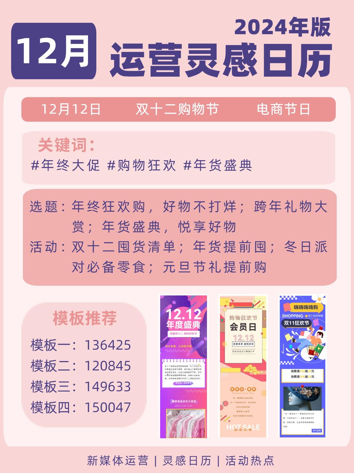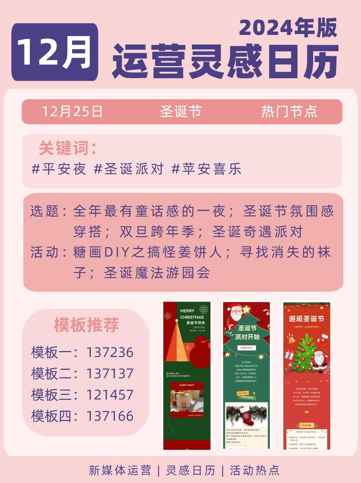 还有12月1日世界艾滋病日、12月2日全国交通安全日、12月3日国际残疾人日、12月4日国家宪法日、12月13日国家公祭日、12月20日澳门回归纪念日、12月31日跨年夜等~ 不要错过热点时间哟~