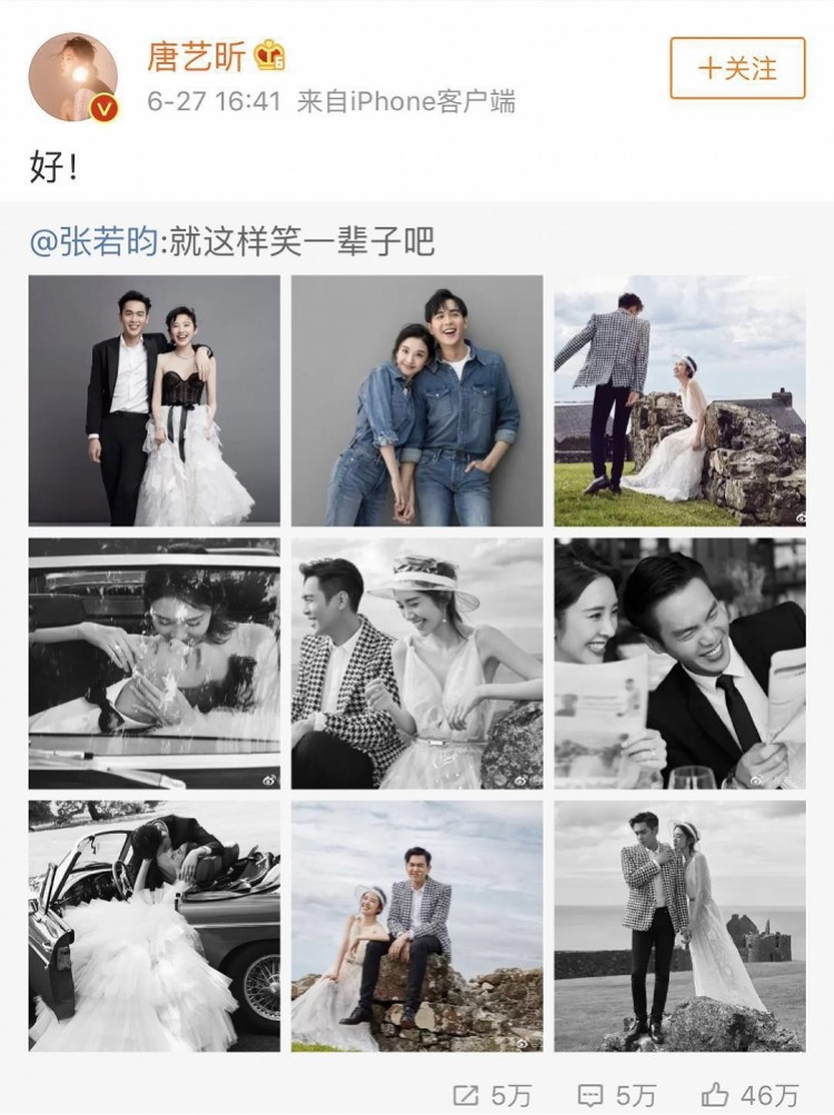 南都讯 6月27日,张若昀在微博晒出与唐艺昕的婚纱照正式宣布结婚,甜蜜配文:“就这样笑一辈子吧 ”。唐艺昕很快转发了这条微博,并且说了一个“好”字,虽然简单,但是情深义重!