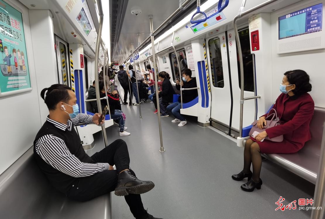 2021年12月16日,广西南宁地铁5号线正式对外开通营运,正线全长20.2公里,南起国凯大道站,北至金桥客运站,共设17座车站,是连接南宁西南至东北方向的骨干线路。图为市民在乘车。(喻湘泉摄/光明图片)( 文章来源:光明图片)