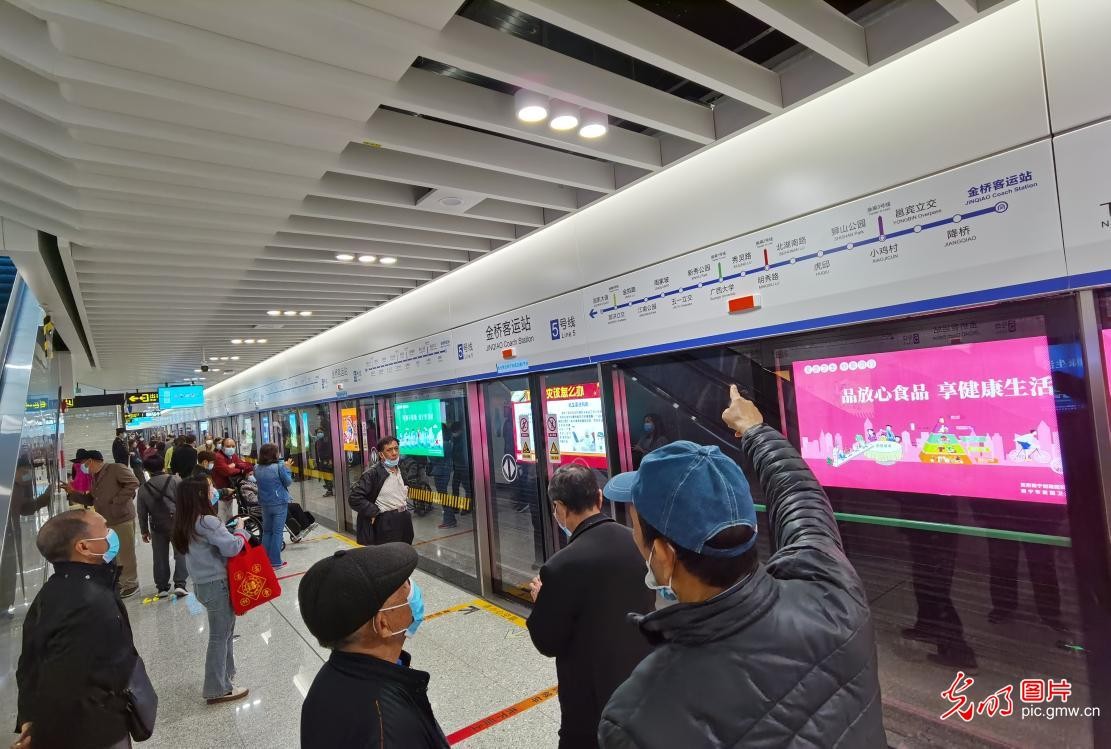 2021年12月16日,广西南宁地铁5号线正式对外开通营运,正线全长20.2公里,南起国凯大道站,北至金桥客运站,共设17座车站,是连接南宁西南至东北方向的骨干线路。图为金桥客运站,市民在等候乘车。(喻湘泉摄/光明图片)