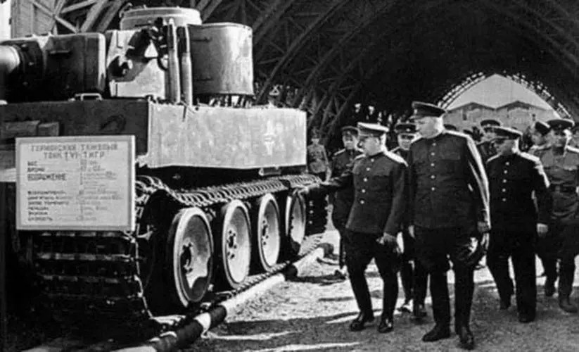 苏联朱可夫元帅正在检查一辆被俘的虎式坦克。
