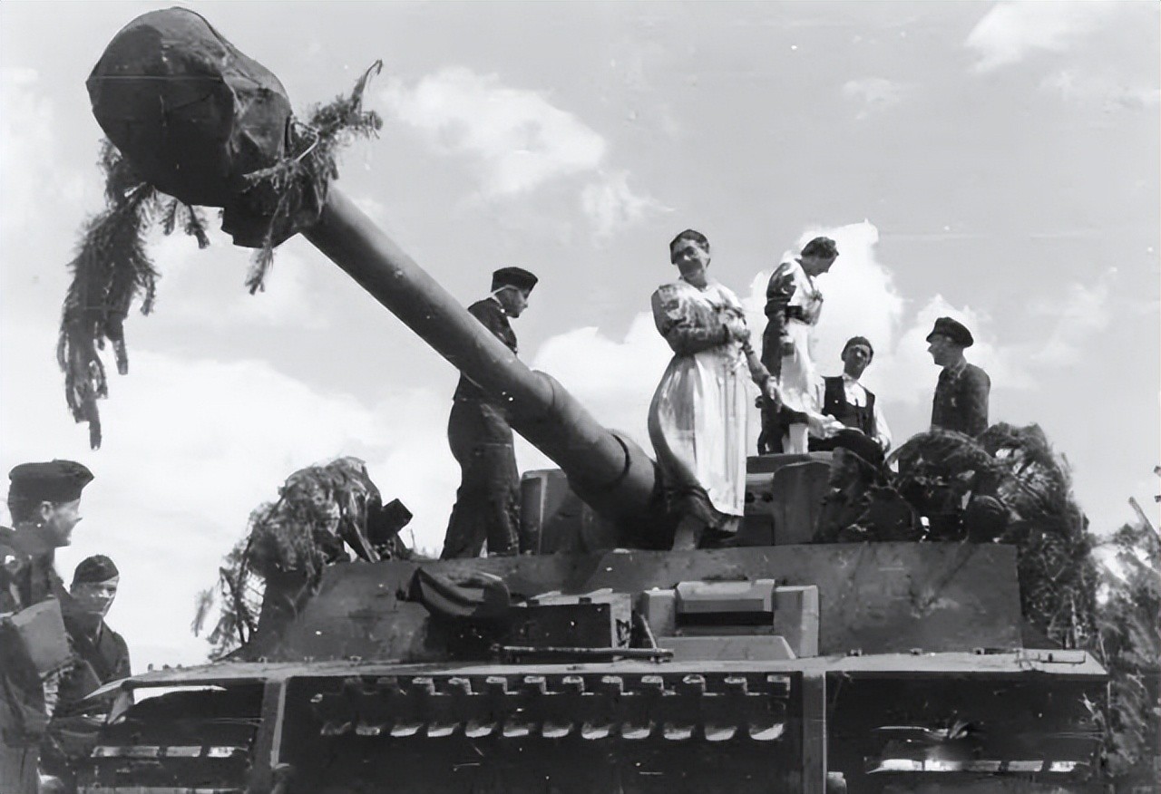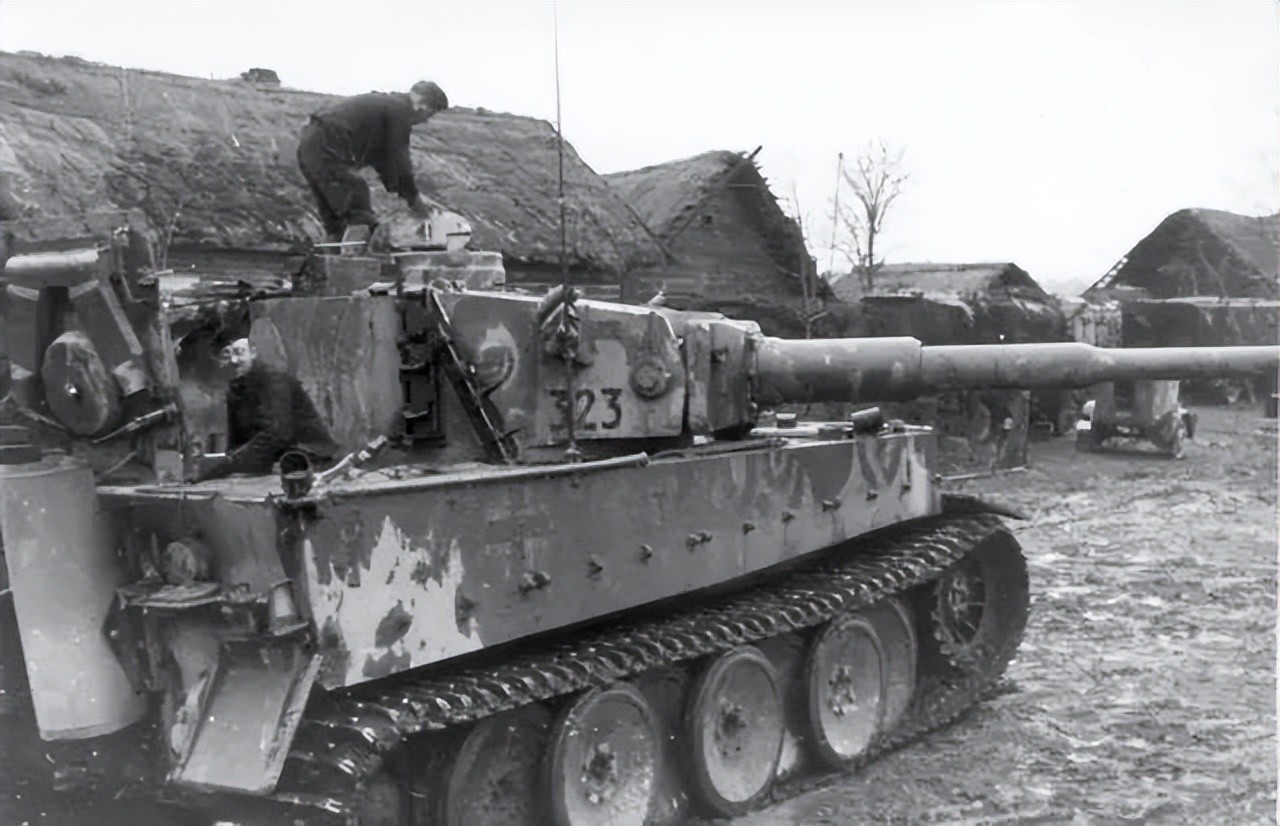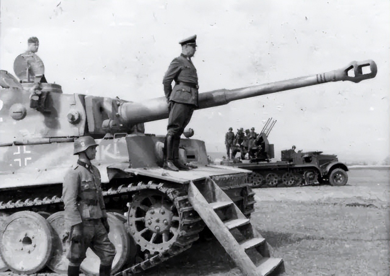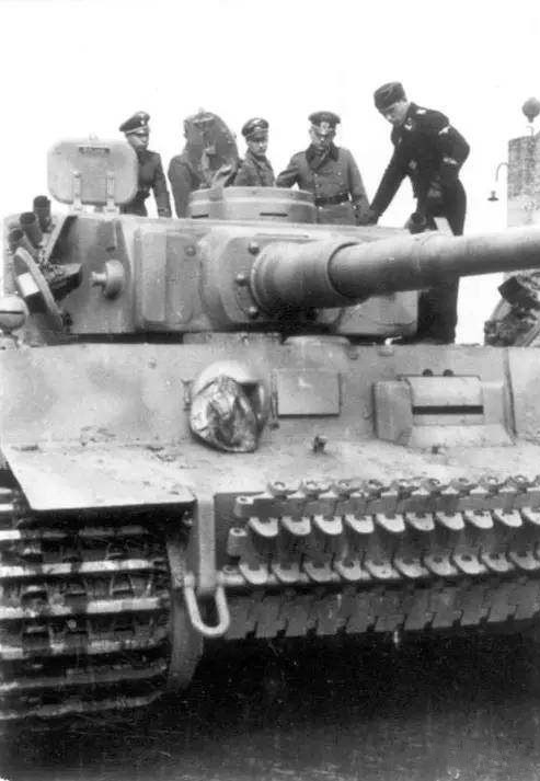 海因里希·希姆莱视察一辆虎式重型坦克的情景。但照片中看不到希姆莱。