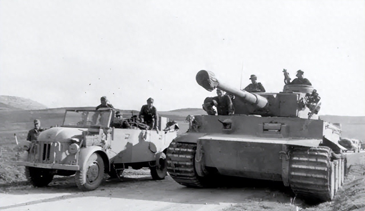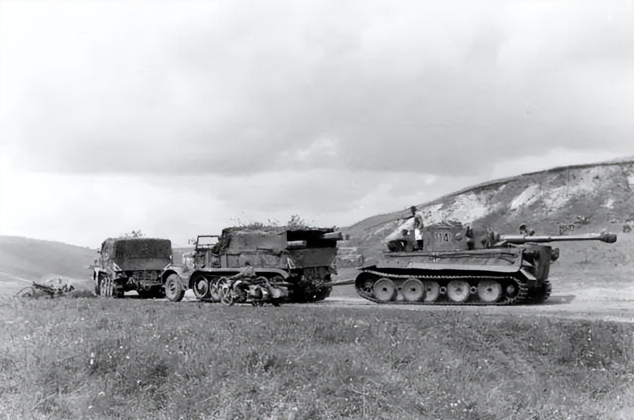 1943年6月,俄罗斯,国防军用半履带车拖着一辆虎式坦克。