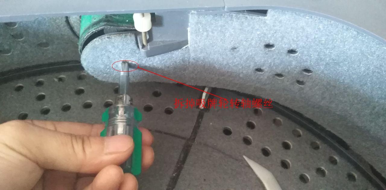 13拆掉输送槽和吸牌轮紧固螺丝,小心撬开输送槽,把输送带套在吸牌轮、传输电机轮上,注意带子有字的一面朝上。