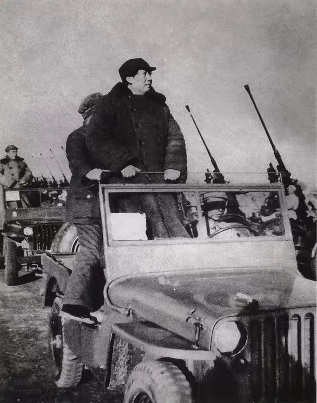 “立——正!”刘亚楼向部队发出了受阅的口令。站在队列前的各分队指挥员举手向领袖毛泽东敬礼。身着灰布军大衣的毛泽东和首长们站立在缓缓行驶的吉普车上,威严庄重地举起右手,向指战员们还礼。