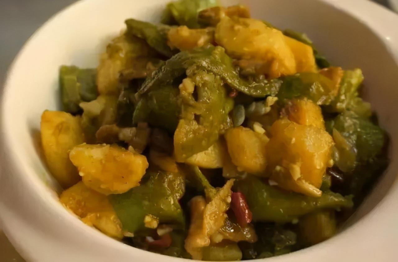 8、翻炒1分钟,倒入已经煎好的土豆;