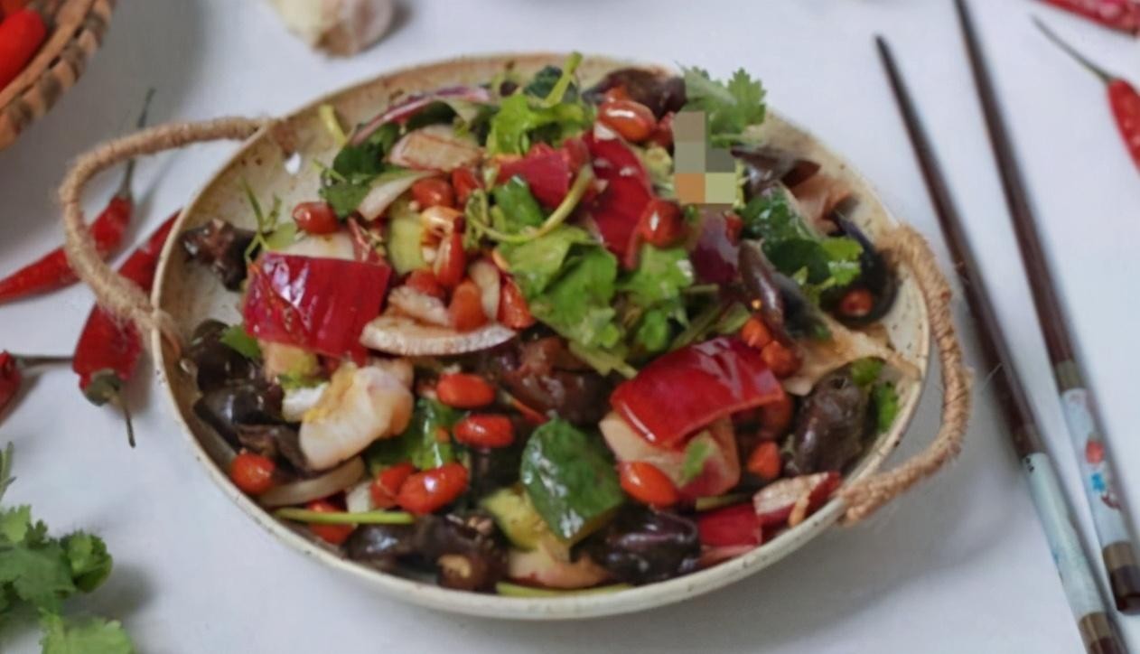 食材:碱发儿肠400克,青笋条200克,青尖椒丁80克,小米辣丁30克,干青花椒20克,泡姜米、蒜米各少许。