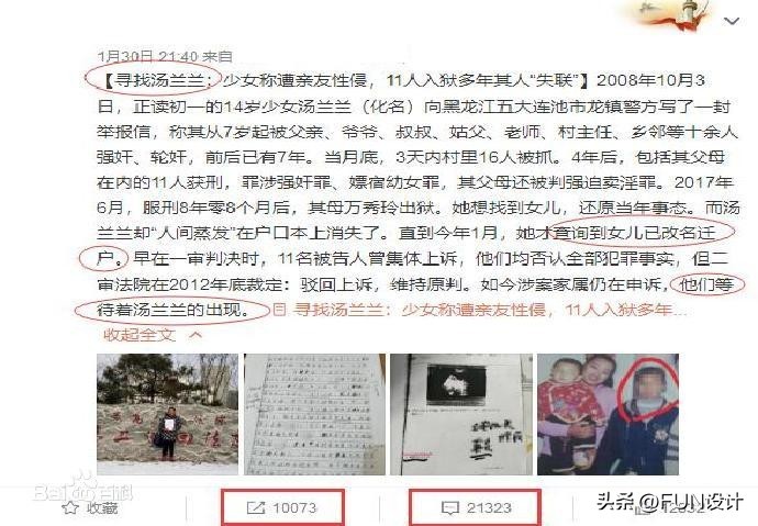 2018年1月30日,澎湃新闻发表《寻找汤兰兰:少女称遭亲友性侵,11人入狱多年其人“失联”》一文;次日,新京报又发表《被全家“性侵”的女孩,不能就这么“失联”着》,这个女孩就以“汤兰兰”的化名引起了广泛关注,这个案件当即也就成为网络舆情的一个热点,论轰动不亚于现在的胡鑫宇案。