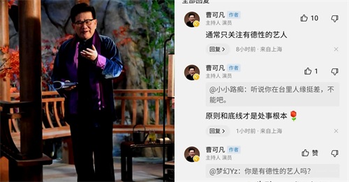 另一名网友直截了当地询问曹可凡对待薛之谦的事件有何看法,曹可凡回应道:“通常只关注有德性的艺人。”这句话引发了更多网友的追问,有人甚至请曹可凡评价自己是否为有德性的艺人。曹可凡这时收敛了锋芒,回应说:“我是媒体人。”