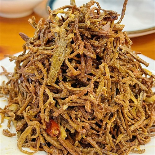 崩肝是正定的另一道名菜,看名字便会让人好奇,吃起来更是惊艳。崩肝的制作工艺比较特殊,选用新鲜的猪肝或牛肝,先下锅煮制八成熟,再捞出晾凉,切成均匀的细丝,这一步对刀工要求很高,再起锅烧油,放入肝丝不停煸炒,待水分蒸发后,再放入生抽、食盐等调料,翻炒几下即可,吃起来咸鲜味美,干香耐嚼,非常下酒。