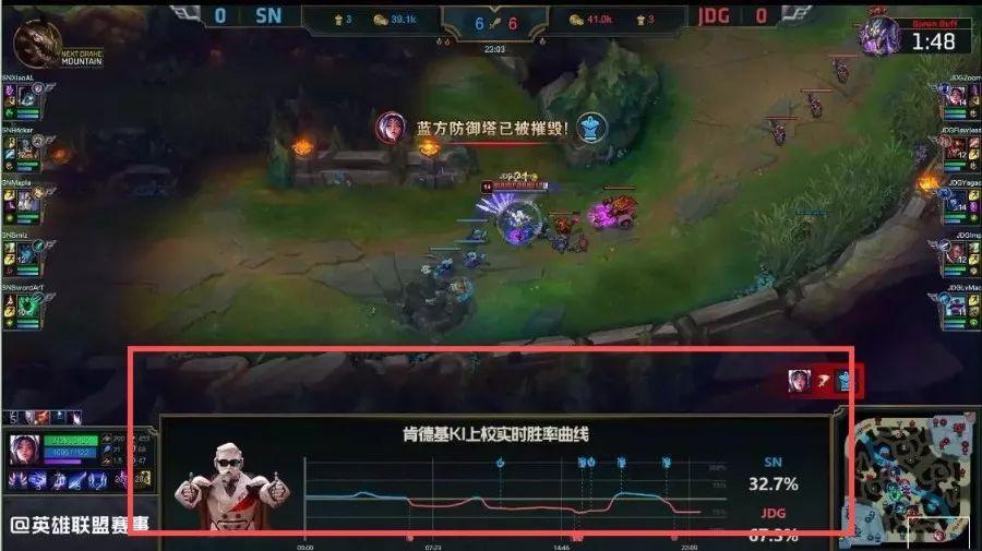 抛开难过的话题,让我们说一说比赛中的趣事。在s系列全球总决赛中,会有一个特殊的分析师——肯德基KI上校,KI上校每场比赛都会在赛前和比赛期间为大家带来胜率的实时数据分析。