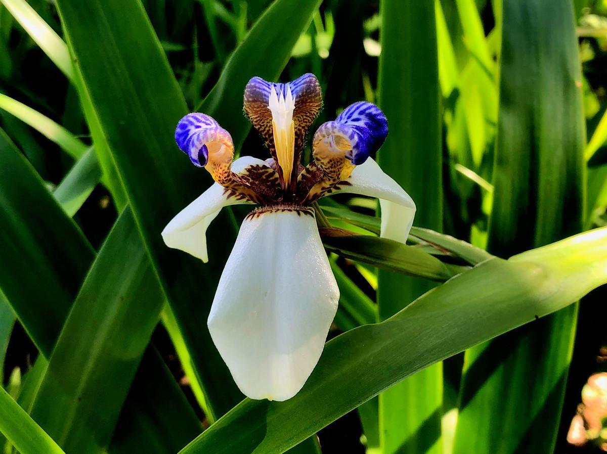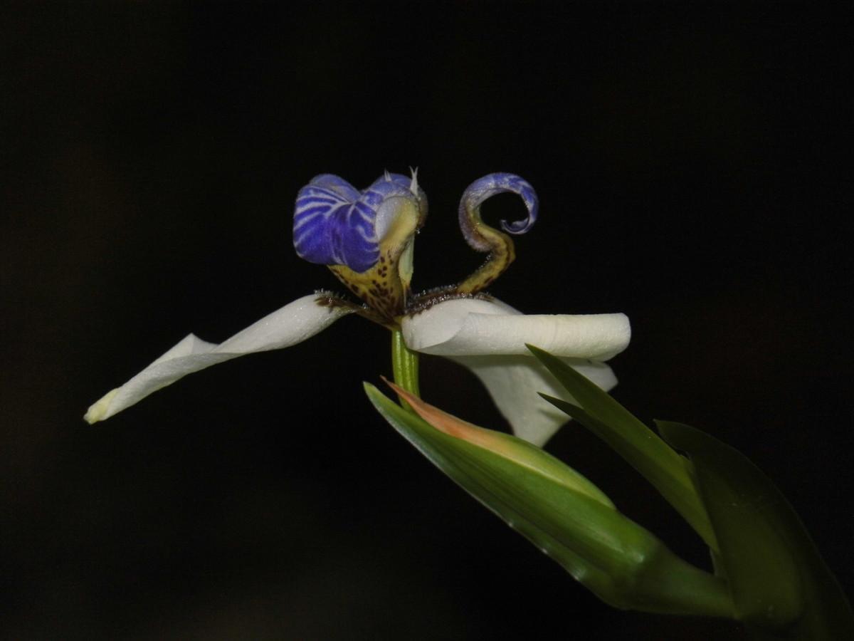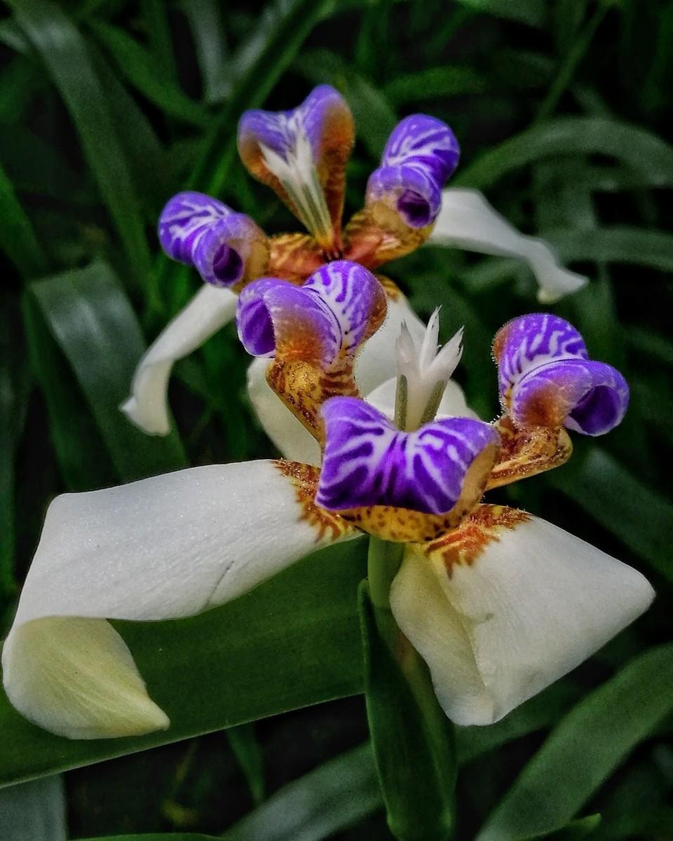 巴西鸢尾的花茎扁平似叶状,但中肋较明显突出。花从花茎顶端鞘状苞片内开出,花有6瓣,其中有3瓣外翻的白色苞片,基部有红褐色斑块,另3瓣直立内卷,为蓝紫色并有白色线条,特别美丽。