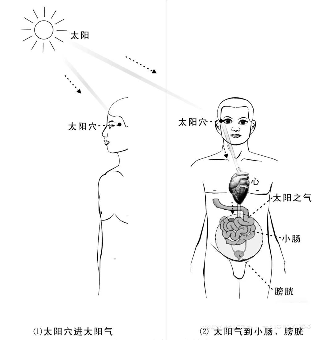 太阳之气,对人体来说,是生命的原动力,特别是与心藏有着直接的联系。当中午时分,太阳之气通过太阳穴进入人体,并非直接存储在大脑,而是流向太阳二经,即足太阳膀胱经和手太阳小肠经。