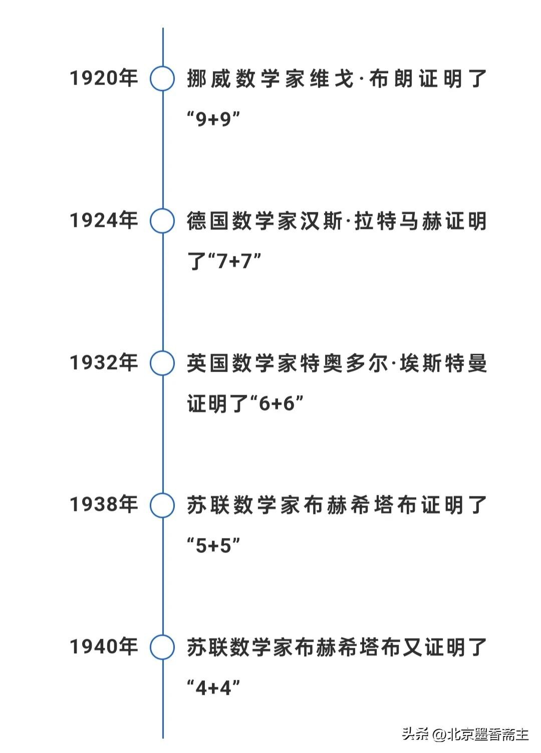 可喜可贺的是1966年,由我国著名数学家陈景润(1933年5月22日—1996年3月19日)“撼动了群山”,证明了“1+2”,即任何一个充分大的偶数都可以表示为一个质数和一个半质数之和。