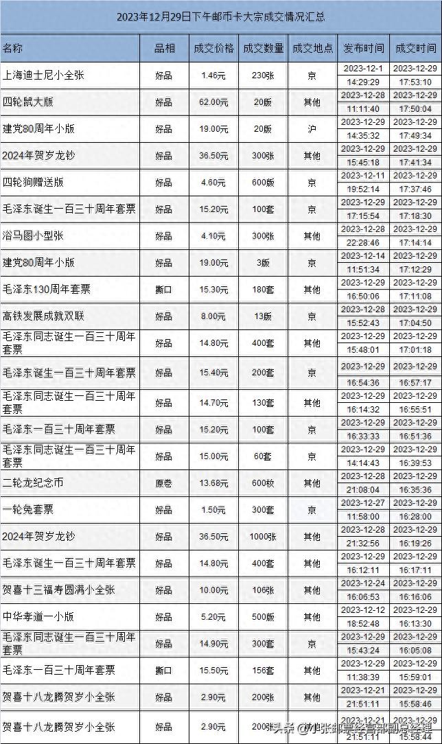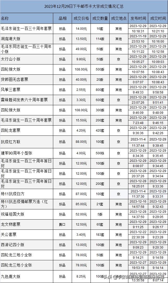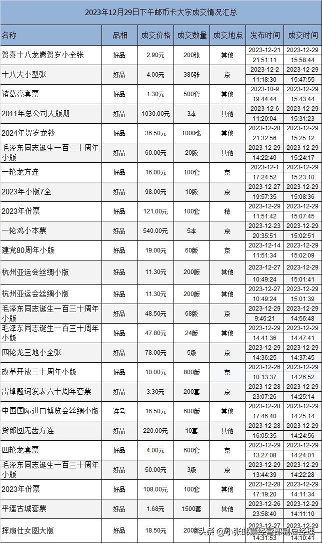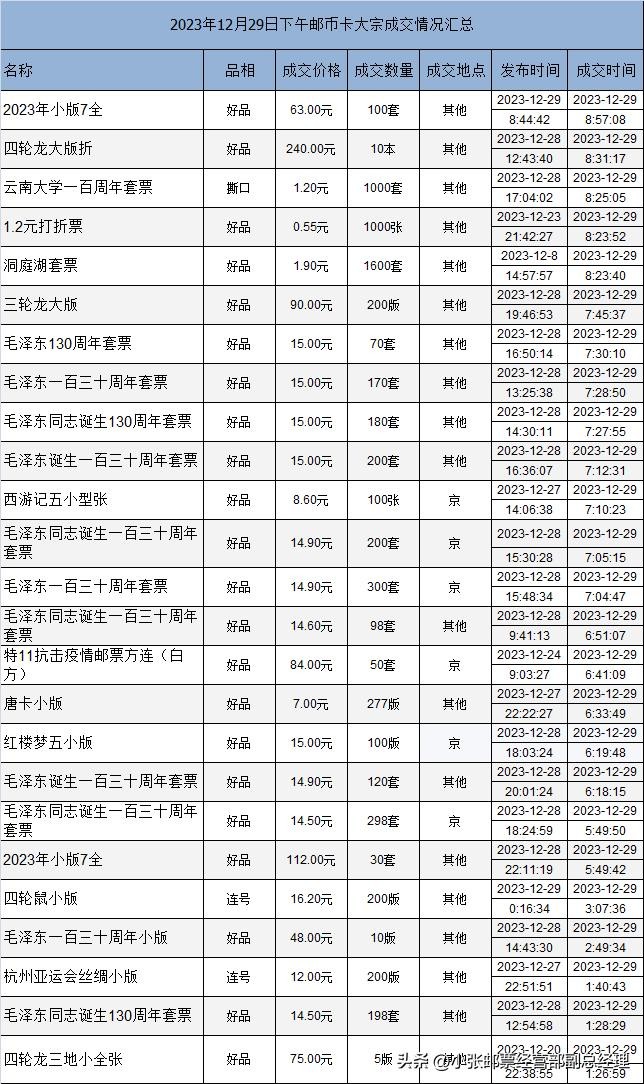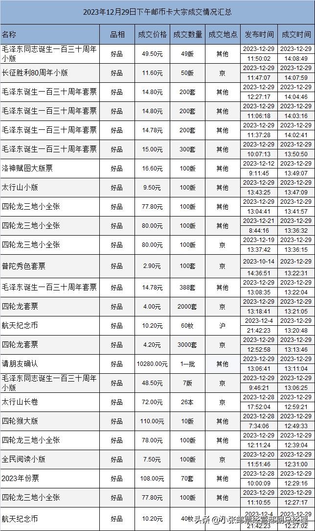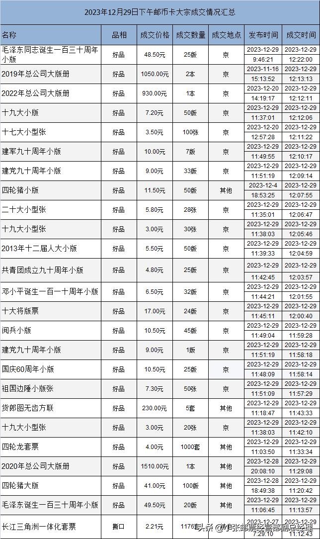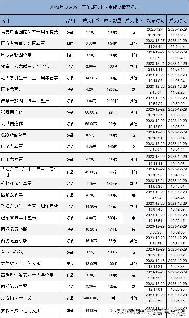 以下是某网2023年12月29日邮币卡大宗成交情况汇总,截止发稿总成交67万。感谢朋友们的关注,小张邮票经营部不定期给大家汇总市场前线的成交情况。