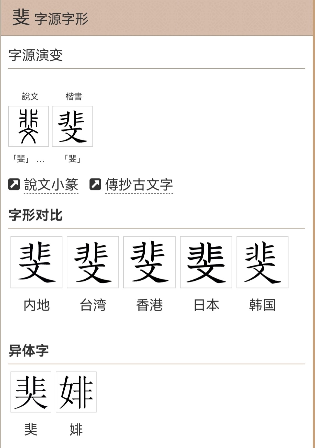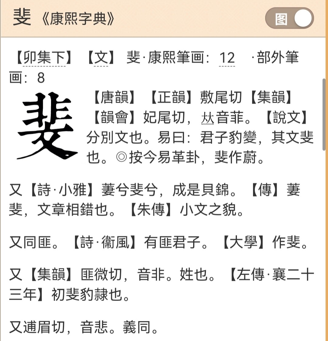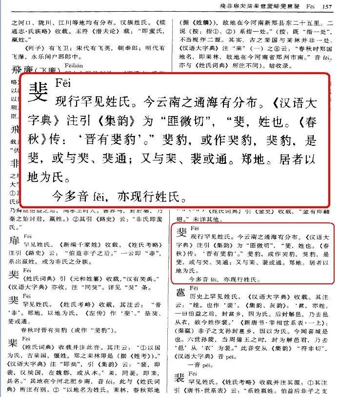 (1)斐可做姓,读第一声,现行罕见姓氏,今云南之通海有分布,《汉语大词典》引用《集韵》为“匪微切”,“斐,姓也”。《春秋》传:“晋有斐豹”。