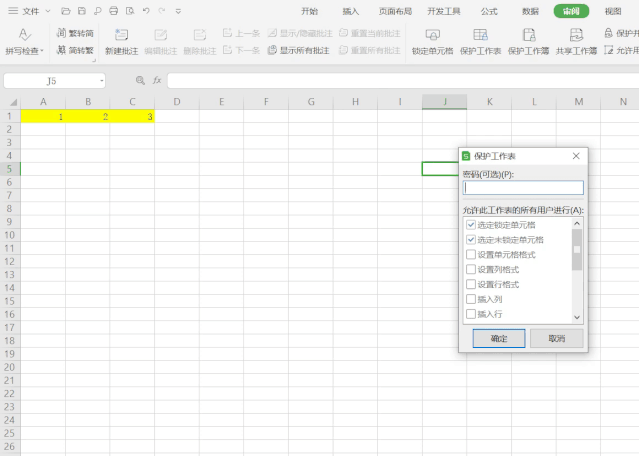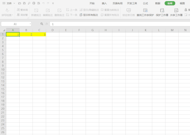 同样利用上面的方法,选中你要锁定的单元格,这里以A1到C1单元格为例。分别给三个单元格录入1,2,3三个数字,然后加上黄色背景。然后勾选锁定。