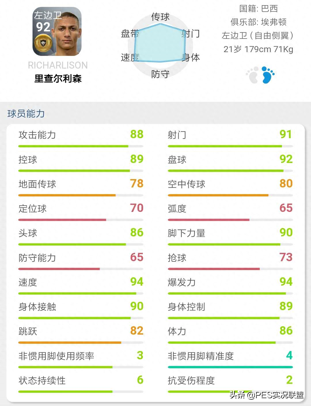 新引擎中的里查而利森无疑是金球中的NO.1,是大家金球三换一的首选项。以金球之身晋升新引擎三大神锋之一,里查尔利森真的有那么神奇吗?答案是肯定的,新引擎中既有身体又有速度,盘控双高射门稳,最关键的是手感还很灵活,在整个实况足球里也找不出第二个关键数据这么出色的完美中锋!多达十个技能加持,并且左右开弓(非惯用脚精准度4,相当于无逆足),omg!太强了有木有!换吧换吧,换不了吃亏换不了上当!傲娇肝到总评88分已经手感爆炸了!